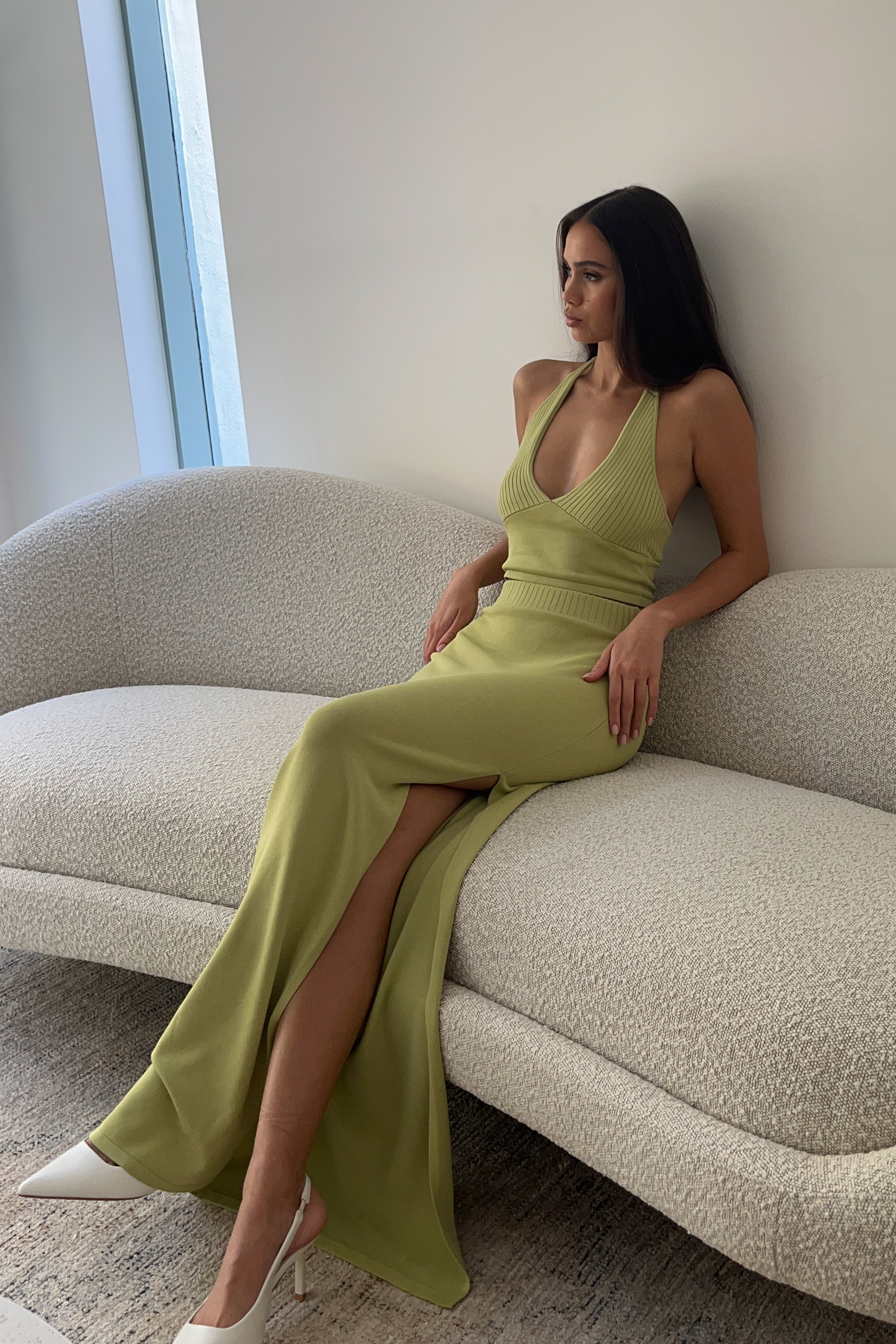 An epitome of poise, DARBY is a stellar maxi skirt with a stunning and fluid silhouette. It features a classic straight cut that makes for a simple yet elegant ensemble. Designed with a ribbed waistband and a sophisticated side seam split. Pair it with the Darby Knit Halter Top for a complete look.