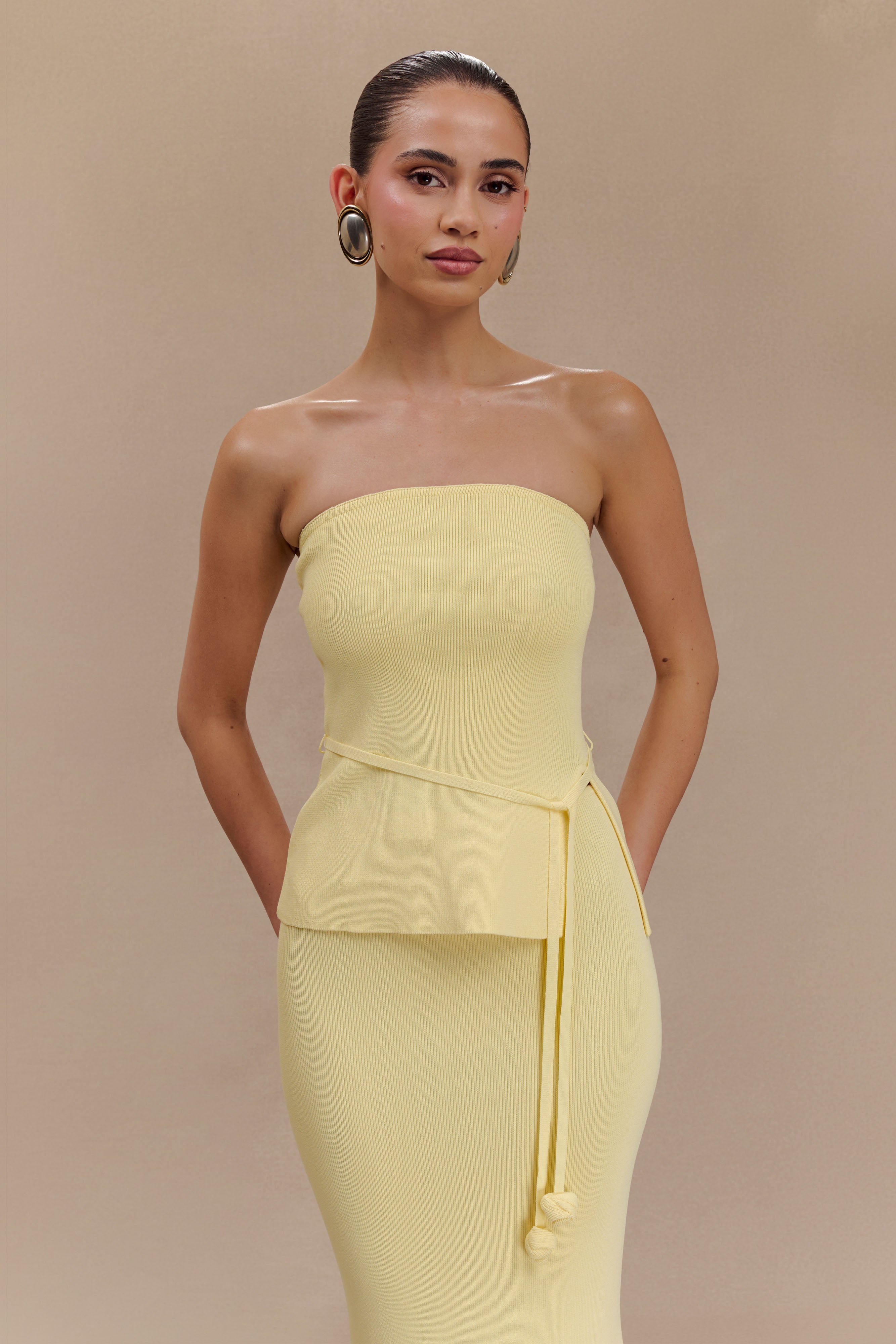 The KEATON Strapless Rose Tie Knit Top is the epitome of effortless sophistication, featuring a flattering strapless neckline with an elastic finish for a secure, comfortable fit. The longline silhouette elongates your frame, while the split detail at the hem adds a modern touch of allure. A waist tie adorned with delicate floral trim creates a beautiful accent that cinches your shape for a feminine finish. Unlined for a lightweight, breathable feel, this piece pairs perfectly with the Keaton Fishtail Knit Maxi Skirt for a chic, coordinated look that exudes timeless elegance.